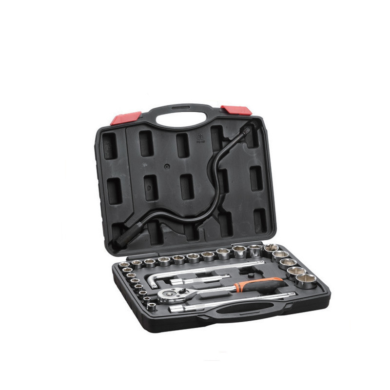 | Komponen | 25 pcs soket 6 titik, 1 pcs soket busi (12"×16"/5/8"), 1 pcs soket busi (12"×21/13/16"), 1 pcs sendi universal (1/2"), 1 pcs extender bar (1/2"×5"), 1 pcs extender bar (1/2"×10"),1 pcs kunci gergaji (1/2 "× 10") |